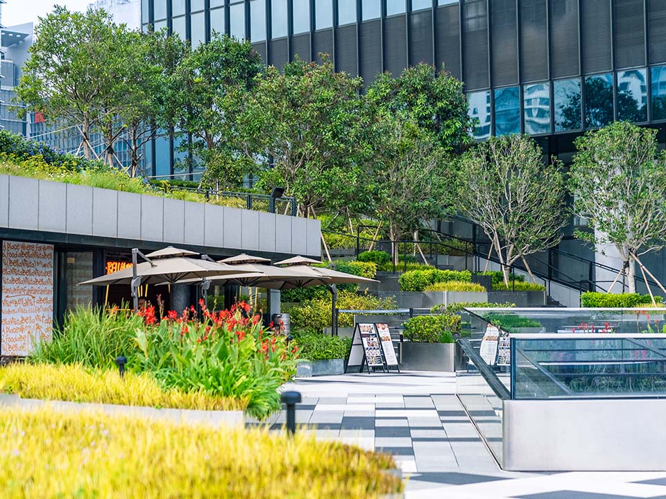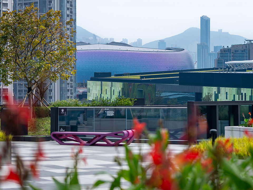 AIRSIDE 6楼空中花园种植了各式各样的茂盛植物和本地花卉,空旷的露天广场是不错的休憩地方。来这里放松之余,不妨在层层递进的露天剧场打卡。站在高处拍摄,拍下绿意盎然的花园与启德社区的城市景色,大自然与都市的色彩形成鲜明对比。商场为宠物友善,带着毛孩来散步,非常悠然自在。