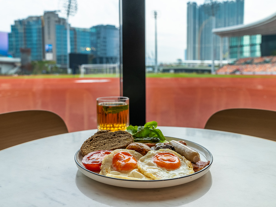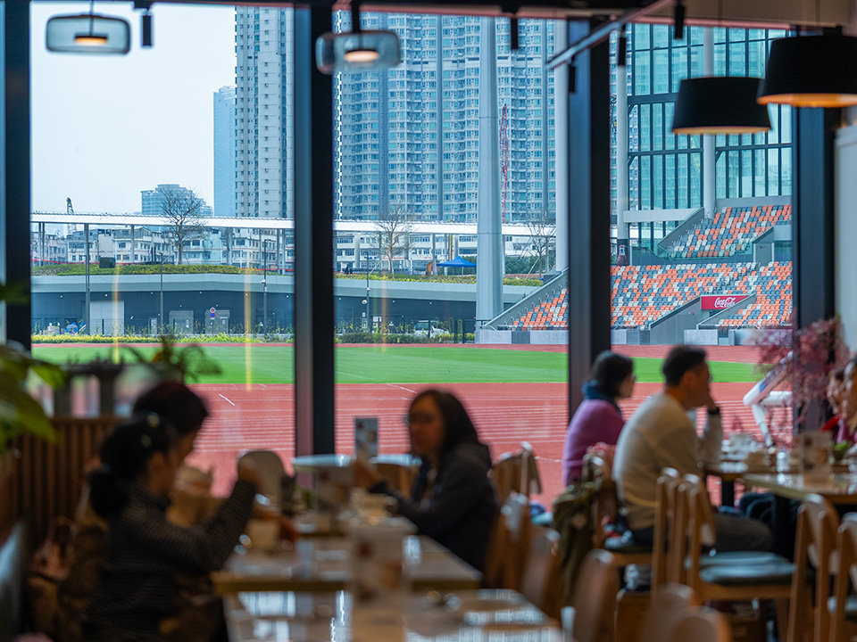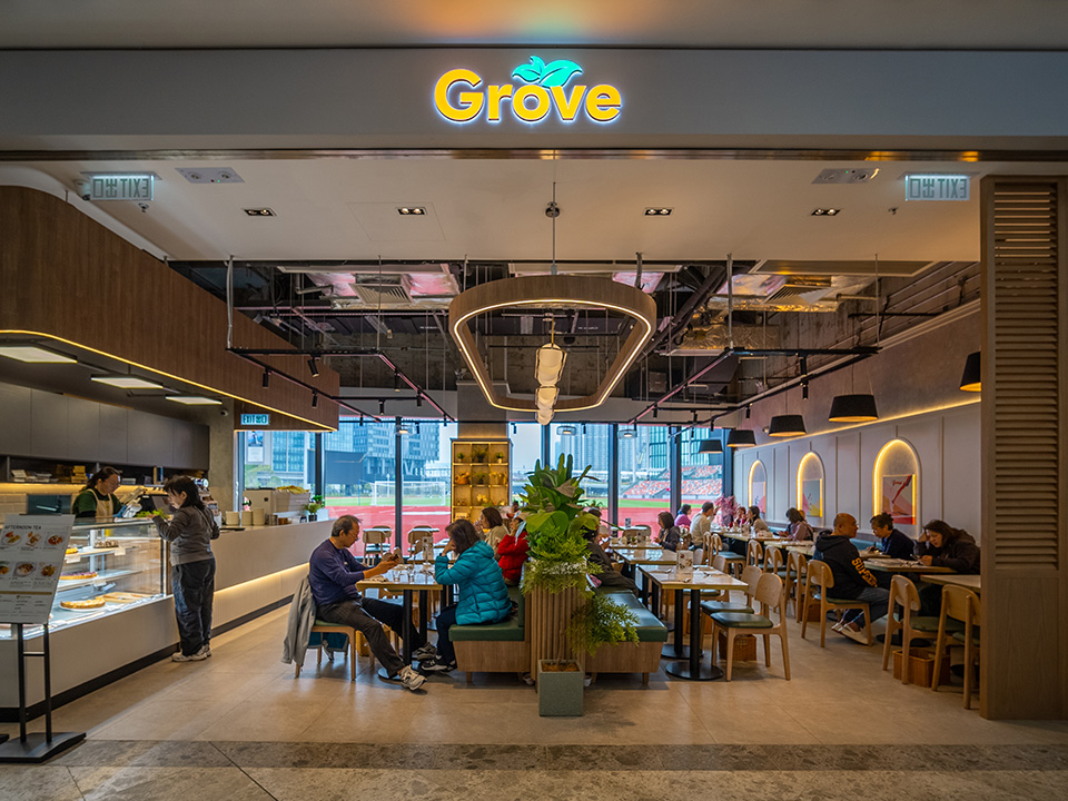 本地健康概念餐厅Grove进驻启德零售馆3,位于启德青年运动场旁边,只有一张落地玻璃窗之隔。来品尝新鲜健康美食的同时,随时可以看到跑道上的精彩活动。坐在餐厅里,环境明亮舒适,运动场的风景一览无遗,色彩鲜艳的跑道和绿色草坪非常抢眼,打卡一流。