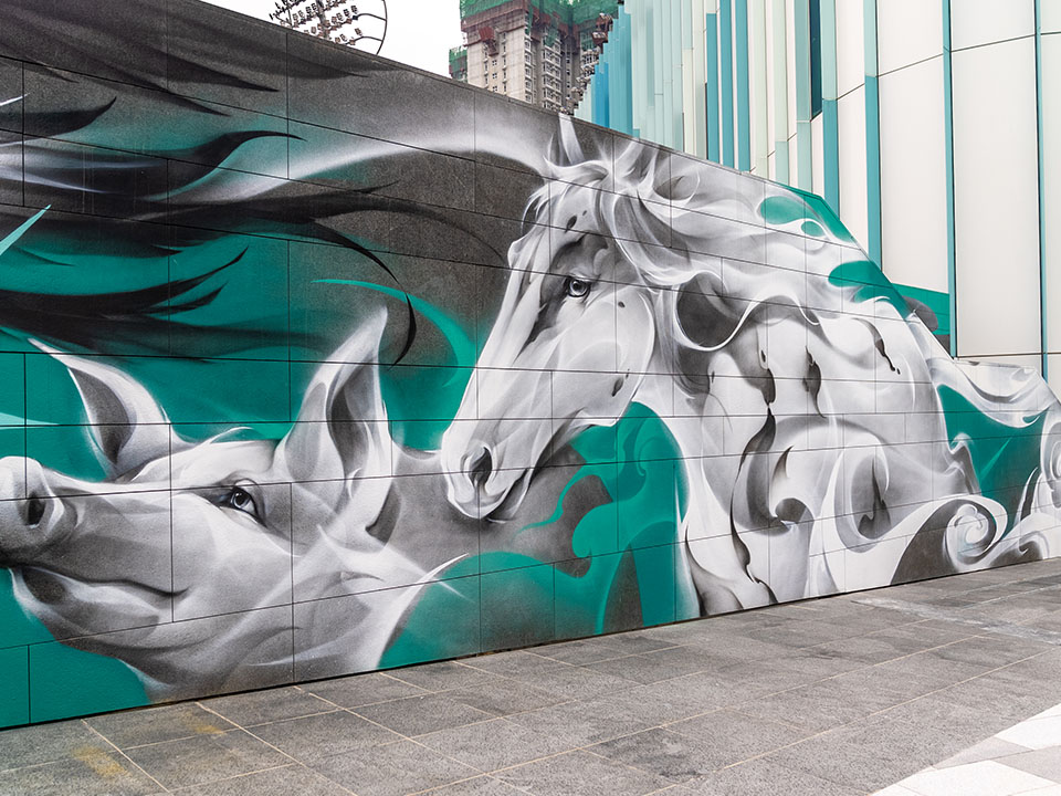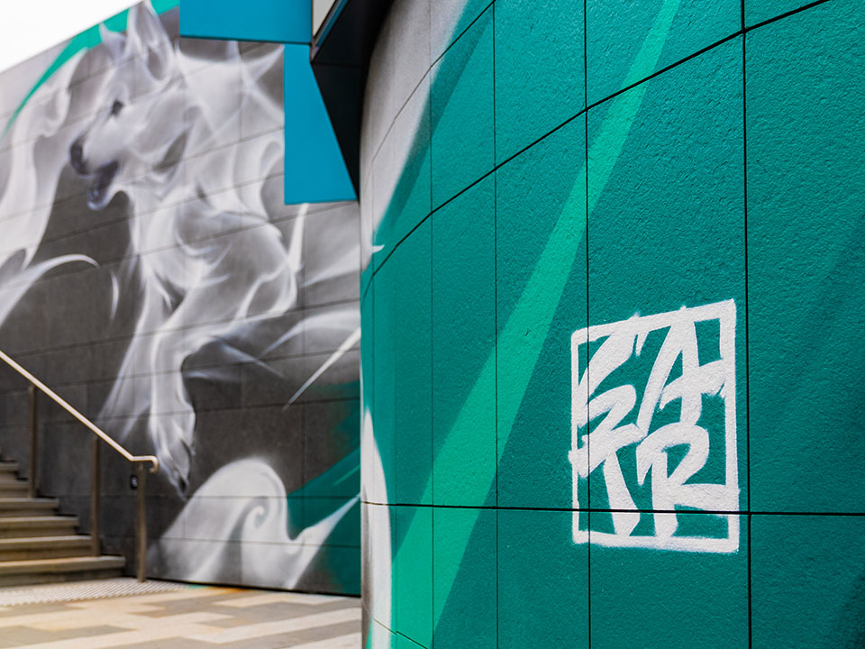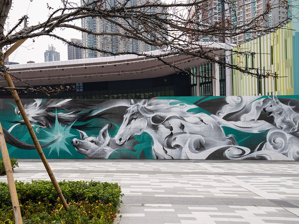 这幅长4米的壁画位于启德体育园运动健康中心旁,由驻伦敦的中国艺术家Satr创作,主题围绕十二生肖。壁画以Satr一贯的黑白水墨画风格为主,画中幻似云雾的生肖动物一同向前奔腾,云雾的形态灵感来自象征吉祥的祥云图案。大家在壁画前尽情拍照打卡后,也可以走上楼梯,一览启德青年运动场的全景。
