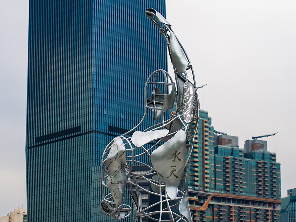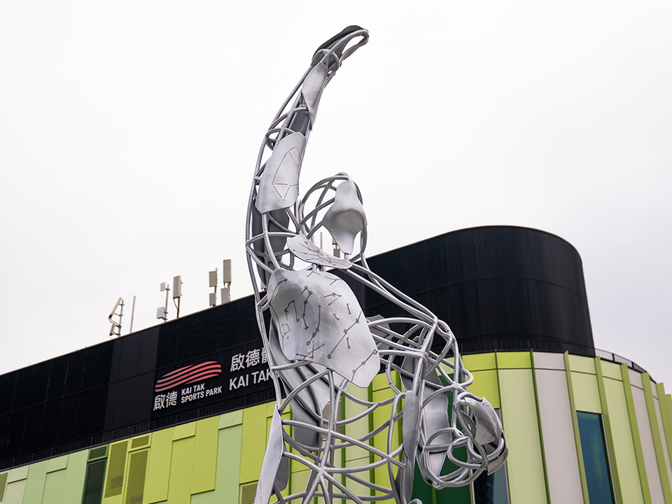 启德体育园另一个大型艺术作品《水连天》,出自澳大利亚艺术家Dominique Sutton之手。位于“水连天”,这座化身为运动员的8米高铝材雕塑,向天空伸出手,象征香港运动员的宏大抱负和决心。金属表面蚀刻了融入香港元素的图案,在夜晚灯光下会隐约映照出地图的影子。
