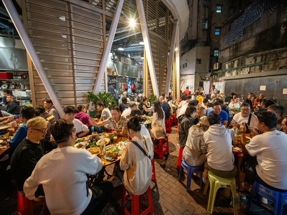 作为庙街的美食地标之一,吴松街临时熟食小贩市场入夜后熙来攘往,气氛好不热闹。市场内有约10个熟食摊位,供应各式各样的小炒及海鲜小菜,其中包括有30多年历史的荣发,其必点菜式包括椒盐鱿鱼、避风塘炒蟹和小炒皇,每一碟都锅气十足。