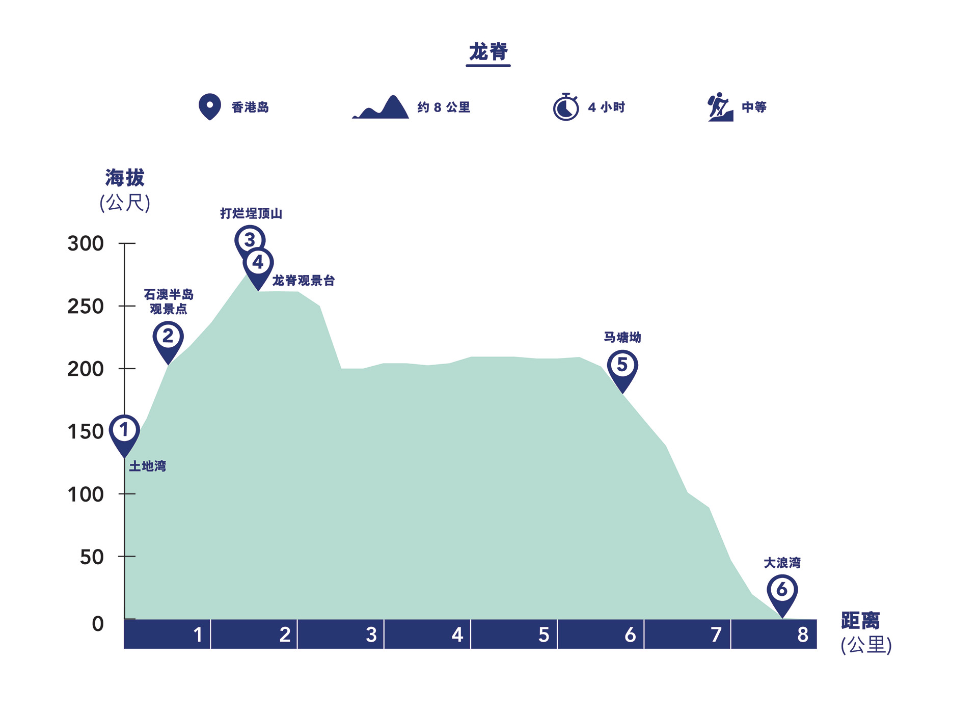 全长50公里的港岛径,起点位于太平山顶,而龙脊一段则位于港岛径的第8段,亦是最后一段。龙脊是深受登山人士及越野跑手欢迎的路线之一。沿着一条林荫小径往上走,攀上一段长约500米且极具挑战性的陡峭阶梯,你便会到达石澳半岛观景点。在乡村风格的木制平台上设有长凳,你可以在那里稍作休息,放松一下酸软的肌肉,并感受海风拂面的凉爽,继续出发前先欣赏一下石澳半岛的壮丽景色。