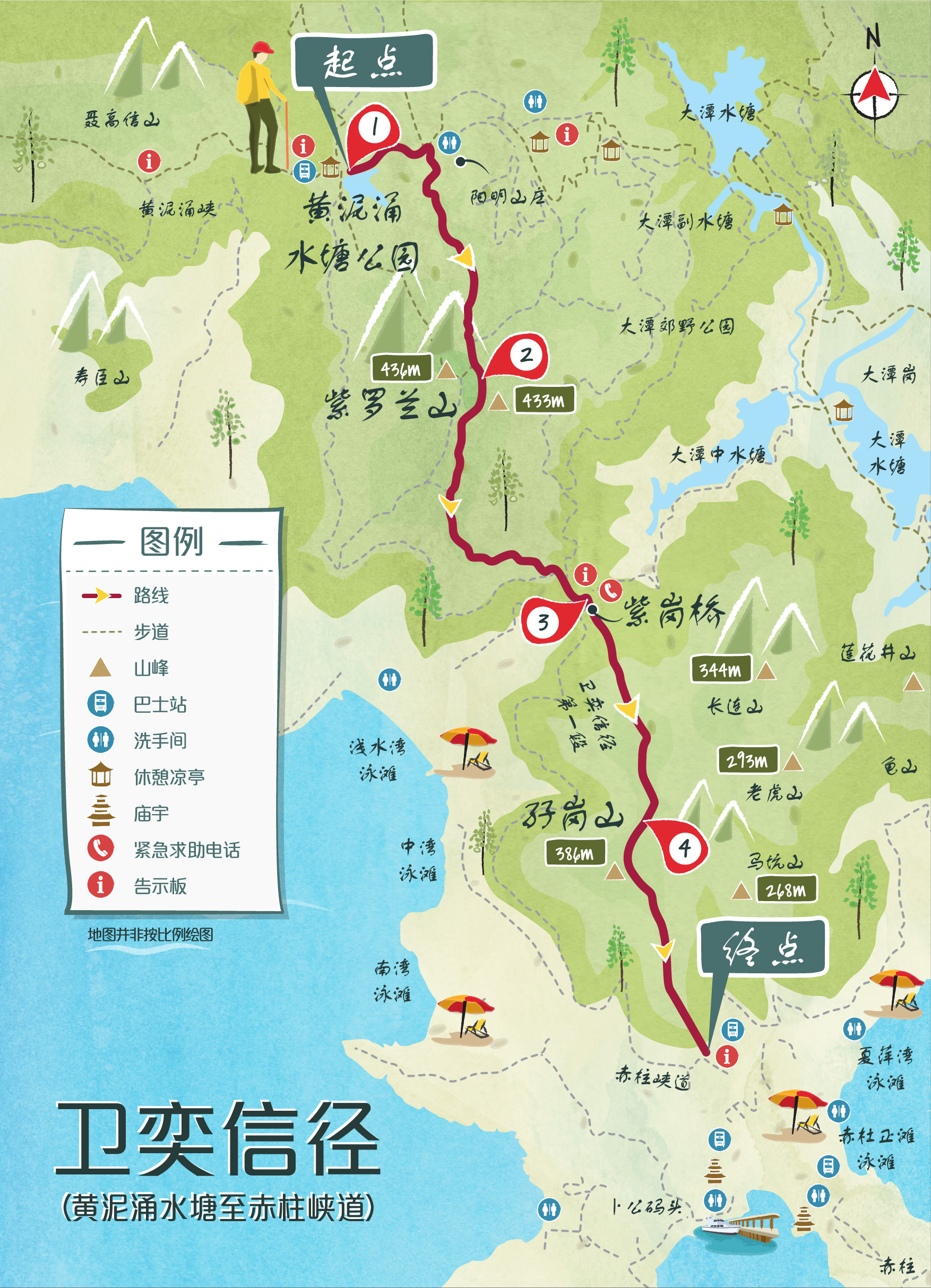 卫奕信径全长约78公里, 共分为十段。由黄泥涌水塘至赤柱峡道是此径的第一段,路程虽然短,却有挑战性。爬上孖岗山和紫罗兰山两座山峰,就得花掉不少体力, 但两山的花海,赤柱及鹤咀半岛的醉人景致,是最好的回报。