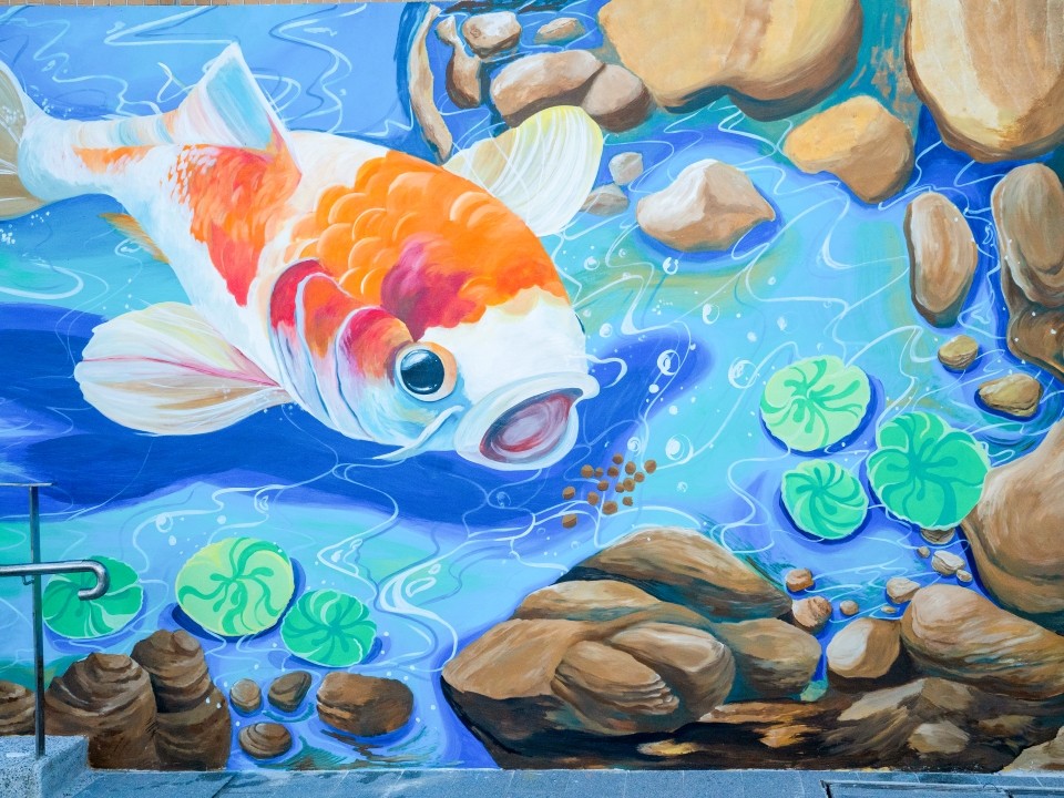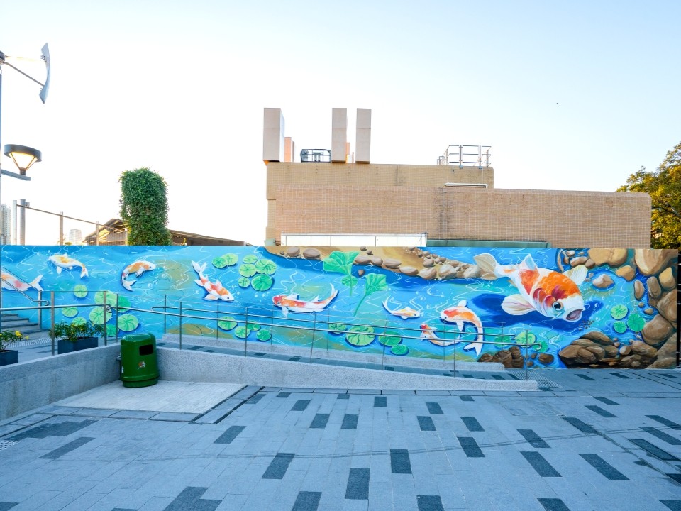 壁画以活泼鲤鱼和翠绿莲叶为主题,展现清澈水域的生态奇观,并设有投喂鲤鱼的互动元素,更添趣味。画中融合石墙与历史遗迹,象征鲤鱼门作为香港东部重要战略重地和商贸发展枢纽的角色。立体石块设计呼应区内盛极一时的石矿业及石屋建筑,让人感受这片土地的历史印记,以及人与自然的和谐共处精神。