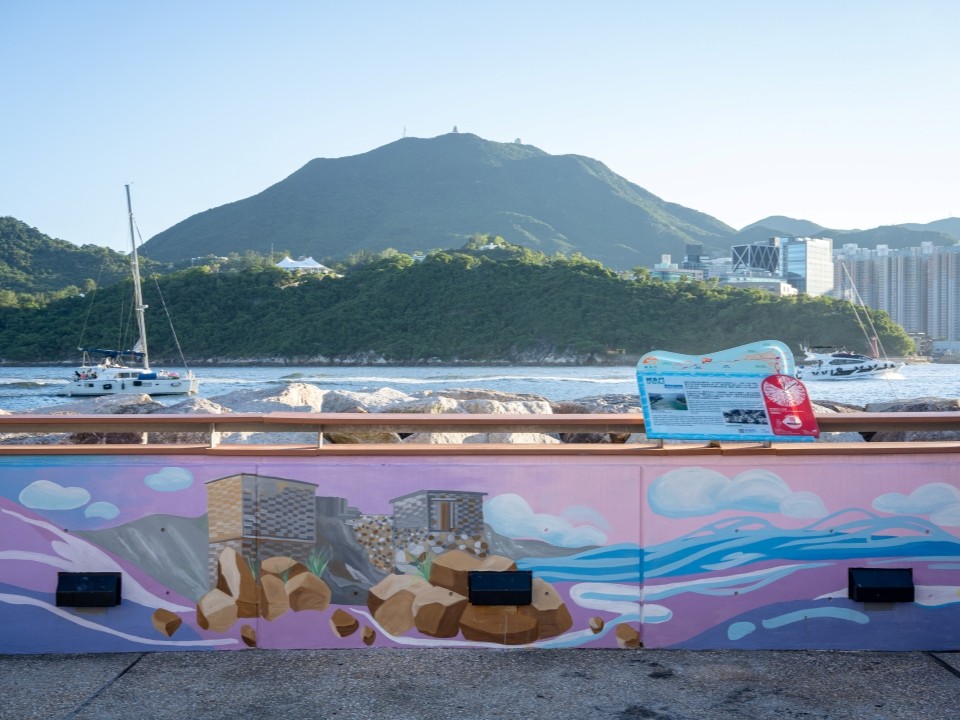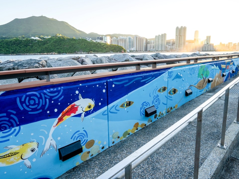 壁画以鲤鱼门海岸及区内著名地标为设计核心,融合色彩缤纷的珊瑚跃然墙上,活现渔港生态繁盛景象。鲤鱼门灯塔及石矿场等历史建筑巧妙融入画面,细腻勾勒海岸、山峦与蓝天相互辉映的风光。粉紫、蔚蓝与翠绿色彩交织,唤起游人对海洋生态的关注。