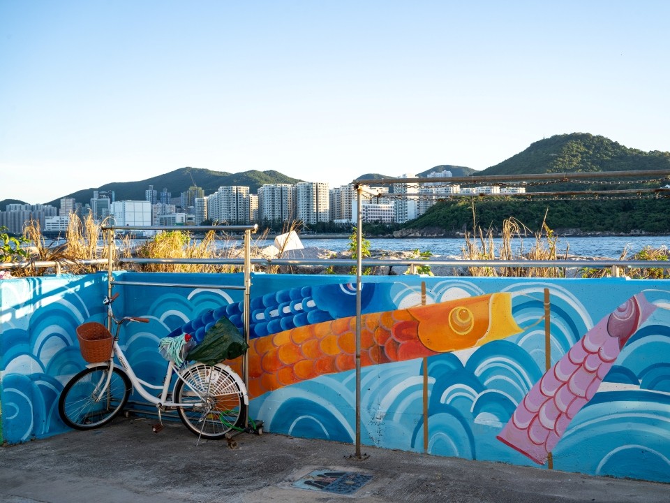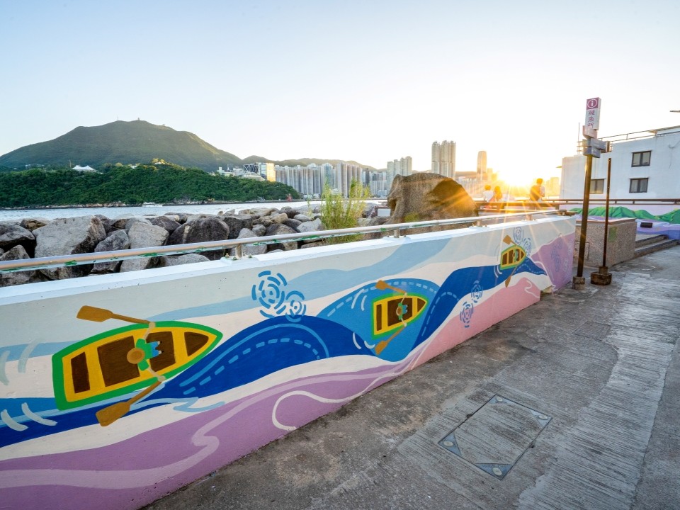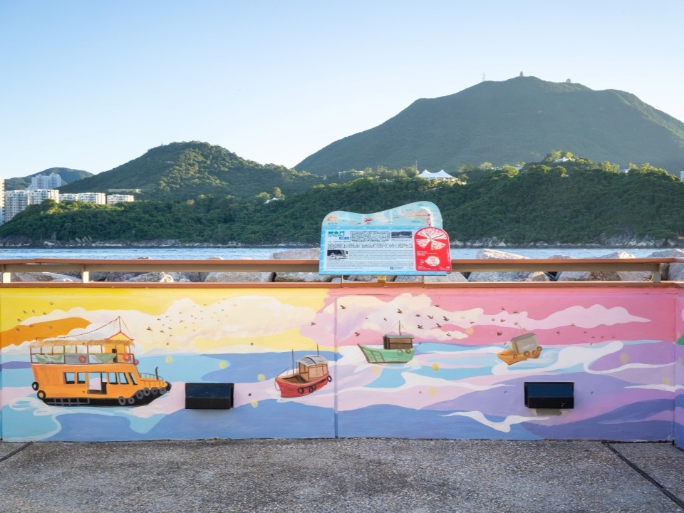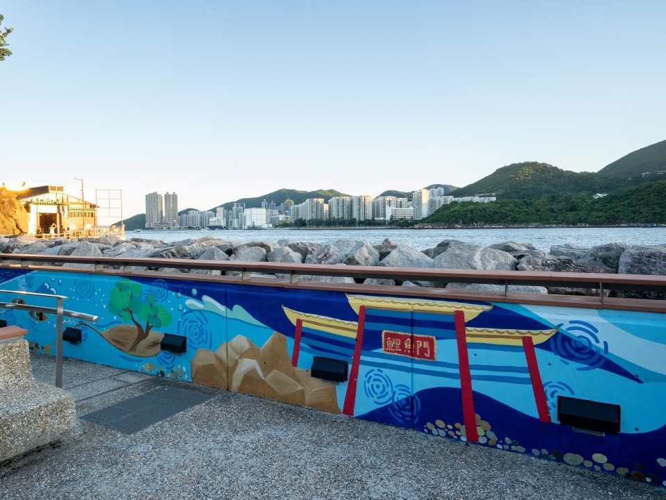 壁画以色彩鲜艳的鲤鱼旗为主题,象征美好祝福与渔村活力。壁画延伸至壮丽海岸、三级历史建筑天后庙与大礁石相连的景致,以及穿梭海面的多艘渔船,呈现鲤鱼门丰富多元的文化与古朴风貌,引领游人细味社区历史与人文自然的独特魅力。