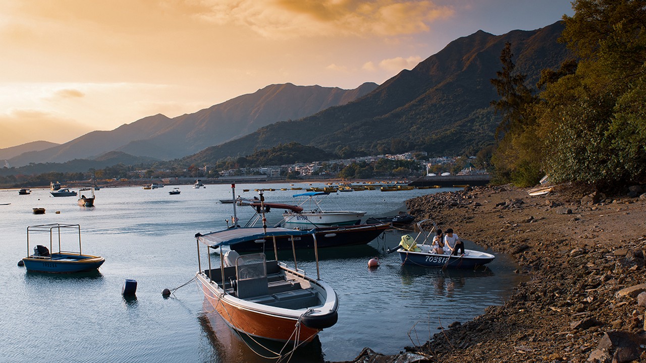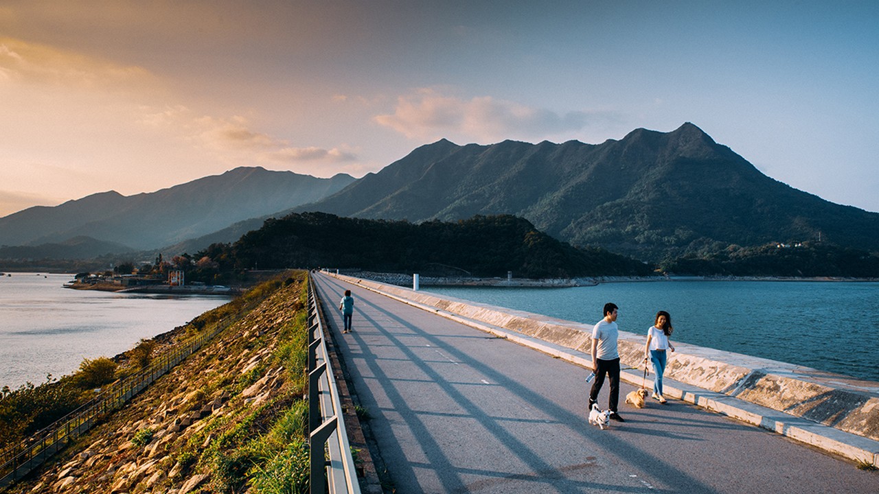 坐在船湾淡水湖主坝上,看吐露港的日落美景。