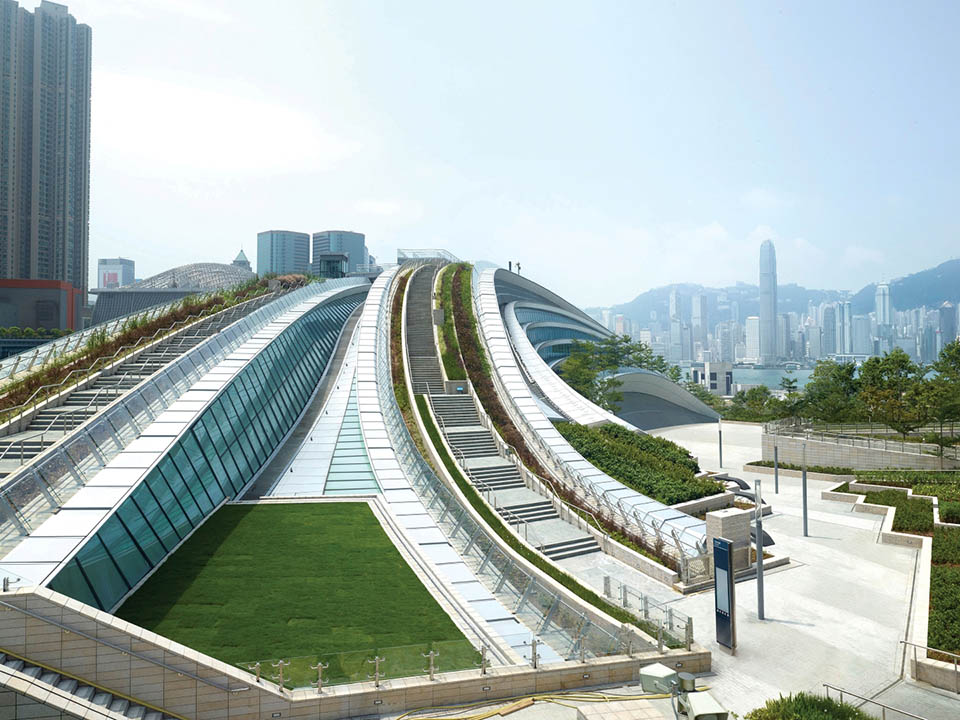 毗邻戏曲中心的香港西九龙站,占地约40万平方米,深入地下25米,连接中国内地和香港。最引人入胜的是天空走廊,沿途绿植环绕,带你直达高铁站站顶的木制观景台。这里视野开阔,香港标志性的天际线、戏曲中心及西九文化区都一览无余,日夜都享有绝佳景致。
