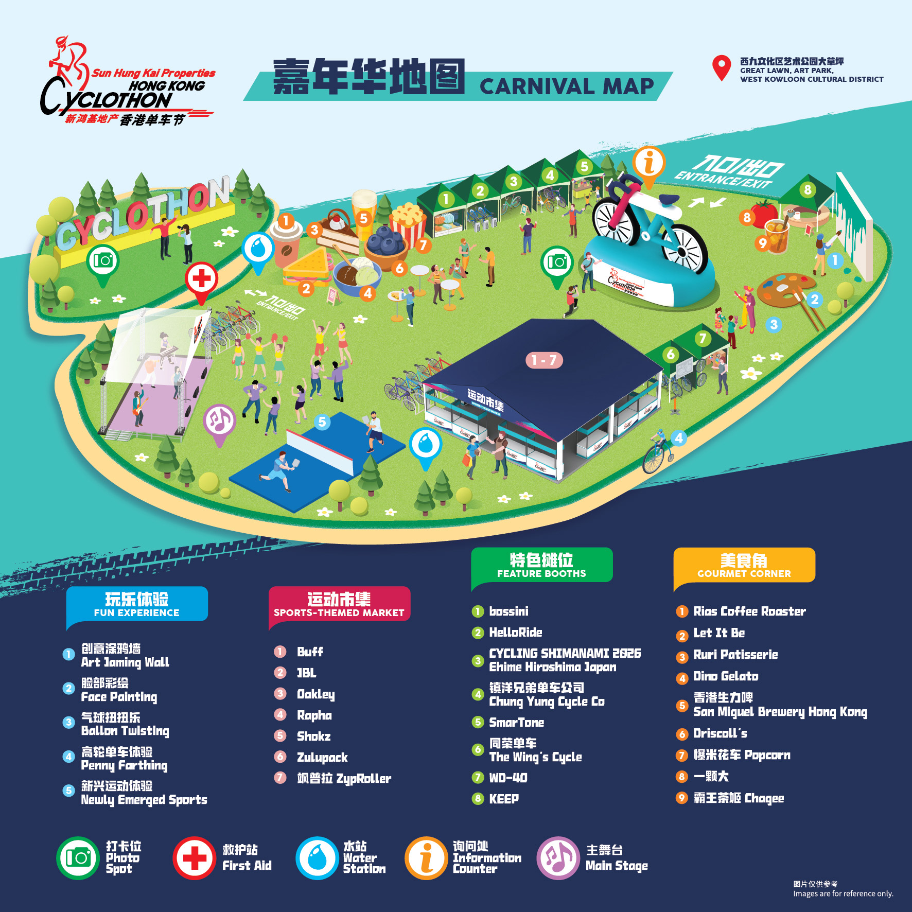 嘉年华由早上至黄昏,分时段上演多元化表演,融合音乐与运动元素,为现场观众带来节奏感十足的视听享受。现场更设有丰富活动,包括美食摊位、运动装备展销、新兴运动互动体验、面部彩绘及气球艺术工作坊等,让市民与旅客尽情投入,感受嘉年华的欢乐氛围。
